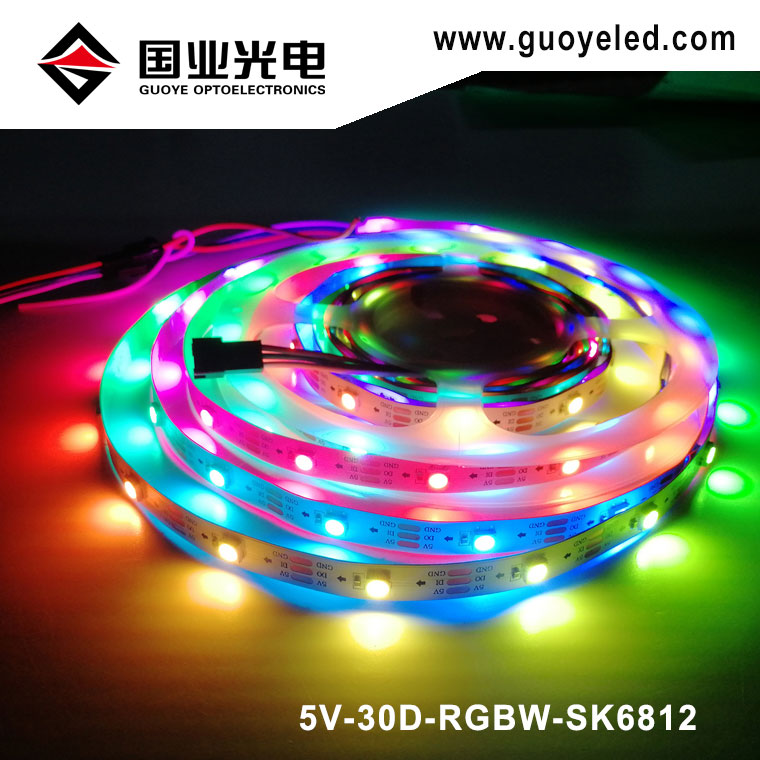 La tira LED direccionable RGBW está integrada IC SK6812 inteligente en RGB + W 5050SMD LED, el color blanco RGBW puede ser blanco cálido 3000K, blanco natural 4000K o blanco puro 6000K, es una versión mejorada de RGB, puede emitir 16 millones de colores de luz estática, pero También puede generar una variedad de efectos de persecución dinámicos. El diseño de la tira LED direccionable RGBW tiene 30 LED por metro (30 píxeles independientes), 5 metros como un rollo (16.4 pies), IP30 no resistente al agua u otros niveles de impermeabilidad también están personalizados. El SK6812 tiene una variación de color más rica y posibilidades de combinación de colores, pantalla de brillo 256, pantalla a color de 32 bits. Cada píxel tiene su propio color y brillo. Puede controlarlos individualmente y configurarlos en cualquier color o animación que desee